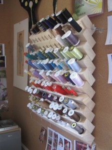 Het rekje biedt plaats aan ruim honderd klosjes machinegaren. De afstand tussen de deuvels van 3cm werd gebaseerd op het breedste klosje.